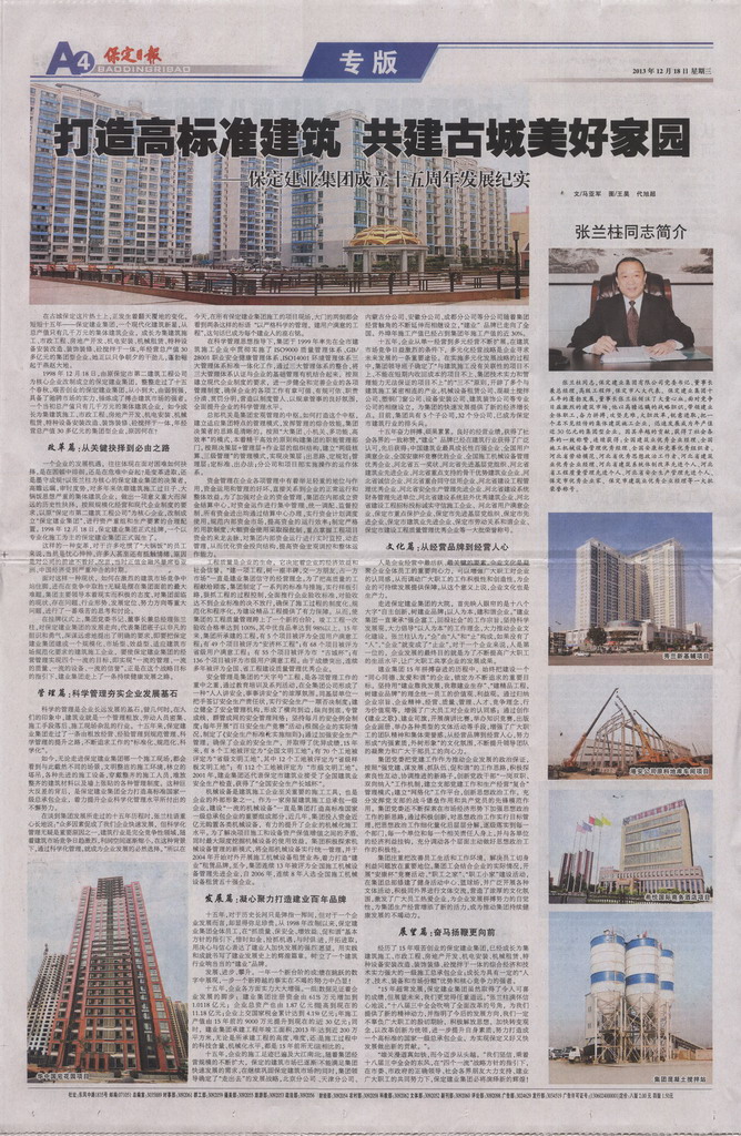 保定日報專版報道集團公司成立二十周年